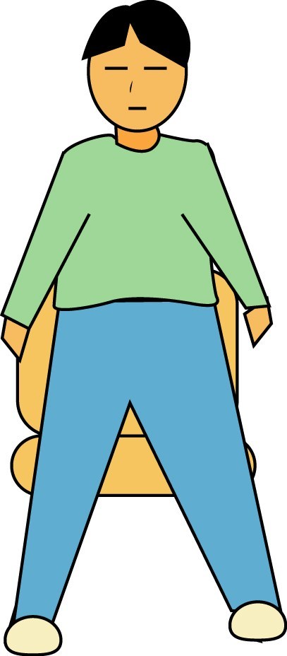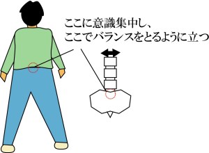 背筋を伸ばし、背骨と腰骨の交わるあたりに意識を集中し、そこでバランスをとる感じで体全体の力を抜いて立ちます。 (1分程度)